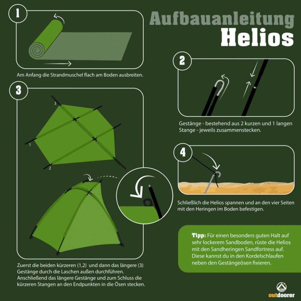 Nie wieder schweres Herumschleppen von Sonnenschutz, nie wieder Sperrgepäck, nie wieder Sonnenbrand am Strand! Bei der Helios Air 850 ist der Name Programm. Die Zahl steht für die ultraleichten 850 g dieser Reisestrandmuschel, ermöglicht durch hochwertiges Aluminiumgestänge. Doch nicht nur das äußerst geringe Gewicht wird durch das Air im Namen verdeutlicht. Air steht auch für ideale Belüftung durch ein verschließbares Netzfenster und die "Flugfähigkeit" der Strandmuschel - denn dank Minipackmaß (40 x 8 x 8 cm) kann diese im Koffer und somit Flugzeug transportiert werden. Dabei seid ihr weltweit vor schädlichen UV-Strahlen, Wind und fremden Blicken geschützt - und nehmt sie im Gepäck dabei kaum wahr! Leicht, leichter, Helios Air 850! Dank Aluminiumgestänge ist diese Reisestrandmuschel von outdoorer ein wahres Federgewicht. Zusammen mit dem Minipackmaß kann sie weltweit einfach im Koffer transportiert werden, um euch dank extrem hohem UV 80-Sonnenschutz vor Strahlen zu schützen! Technische Facts - Ultraleichte Reisestrandmuschel Helios Air 850: Dimensionen: 170 x 100 x 100 cm Gewicht: ultraleichte 850 g Passt in jeden Koffer: 40 x 8 x 8 cm - Minipackmaß Platz für 1-2 Personen Material Strandmuschel: hochwertiges Lumotex 80 Material Boden: robustes PE Gestänge: extrem leichtes Aluminiumgestänge Gestängeeinfassungen: Oxford Polyester Verschließbares Netzfenster für optimale Belüftung Äußerst hoher Sonnenschutz UV 80 nach UV STANDARD 801 Meshtaschen zur Aufbewahrung von Gegenständen Praktische Aufhängeschlaufe zur Befestigung von Lampe oder Ventilator Laschen für Sandheringe Zubehör: Transporttasche, Abspannleine, Standardheringe Reisestrandmuschel mit Minipackmaß Strandtuch, Kühltasche mit Verpflegung, Volleyball, Sonnenschirm, Liege ... für manche Wege zum Strand ließe sich beinahe ein Umzugsunternehmen beauftragen. Die Reisestrandmuschel Helios Air 850 ist die ultraleichte Alternative zu sperrigen Strandutensilien: Mit einem Minipackmaß von nur 40 x 8 x 8 cm kann sie im Gegensatz zu Sonnenschirm und Liege lässig über der Schulter transportiert werden - so spart ihr Platz und Schweiß. Ultraleichte Strandmuschel für 1-2 Personen Sogar eure Kinder können sie spielend leicht tragen, da sie nur 850 g wiegt! Zudem passt sie so in jeden Koffer - sogar im Flugzeug-Handgepäck (Heringe ausgenommen) kann die kleine Strandmuschel verstaut werden. Wobei "klein" das falsche Wort ist - schnell und mühelos aufgebaut ist das Sonnenzelt ein wahres Platzwunder. Mit einer Liegefläche von 170 x 100 cm und einer Sitzhöhe von 100 cm bietet sie 1-2 Personen bequem Platz. Selbst Habseligkeiten finden darin noch Platz, diese können in seitlich angebrachten Taschen bequem verstaut werden. Diese bestehen aus Mesh - so wird verhindert, dass sich Sand darin verfängt und ihr unfreiwillige, feinkörnige Souvenirs mit nach Hause nehmt. Maximaler Sonnenschutz: UV 80-Sonnenzelt mit Fenster Doch selbst "voll ausgelastet" staut sich in dem Sonnenzelt die Luft kaum. Ein verschließbares Netzfenster sorgt für ideale Belüftung - der Sonnenschutz bleibt dabei garantiert. Dieser könnte höher nicht sein: Die renommierten Hohenstein Institute haben UV 80-Schutz nach UV STANDARD 801 zertifiziert. So seid ihr weltweit vor schädlichen UV-Strahlen geschützt. Höchste Stabilität und leichtestes Gewicht dank Aluminiumgestänge Doch nicht nur vor Sonne, auch vor Wind seid ihr im Strandzelt Helios Air 850 sicher. Das extrem robuste Lumotex 80- Material und der PE-Boden werden vom ultraleichten Alumiumgestänge stabilisiert. Durch dieses zählt die Reisestrandmuschel zu den hochwertigsten ihrer Kategorie, da sich Aluminiumgestänge nicht nur durch ultraleichtes Gewicht, sondern auch extreme Robustheit, Beständigkeit und Stabilität auszeichnet. Zudem splittert es nicht. Mit widerstandsfähigen Gestängeeinfassungen aus Oxford Polyester wird die Reisestrandmuschel so zum idealen Windschutz. Für Windspitzen empfehlen wir die im Lieferumfang enthaltene Abspannleine und Heringe. Bei besonders feinkörnigem Sand können Sandheringe Sandfortress verwendet werden. Für diese sind separate Laschen angebracht. Reisestrandmuschel für Strände und Trekkingtouren weltweit Auch vor all zu neugierigen Blicken seid ihr in der Reisestrandmuschel bestens geschützt. So wird diese zum idealen Begleiter weltweit. Doch natürlich kann das Sonnenzelt mit UV 80-Schutz nicht nur am Meer eingesetzt werden. Auch bei Trekkingtouren, Campingausflügen, Tagen am See oder im heimischen Garten bietet es (ultra)leicht zu transportierenden Sicht-, Wind- und Sonnenschutz. Kompakte Strandmuschel mit Aufhängeschlaufe Die Helios Air 850 bietet eine integrierte Aufhängeschlaufe, mit der du bei Bedarf einen kleinen Ventilator oder eine Lampe im Inneren befestigen kannst. So schaffst du dir auch unterwegs eine angenehme Luftzirkulation und etwas Licht, wenn die Sonne langsam untergeht. Praktisch, durchdacht und ideal für warme Tage am Wasser oder auf Reisen. Einfacher Aufbau der Helios Air 850 in 5 Schritten {{widget type="xonu_widgets/youtube" src="https://www.youtube.com/embed/" fullwidth="1" allowfullscreen="1" allow="accelerometer; autoplay; clipboard-write; encrypted-media; gyroscope; picture-in-picture" showcontrols="1" privacymode="1" lazyloader="1"}}